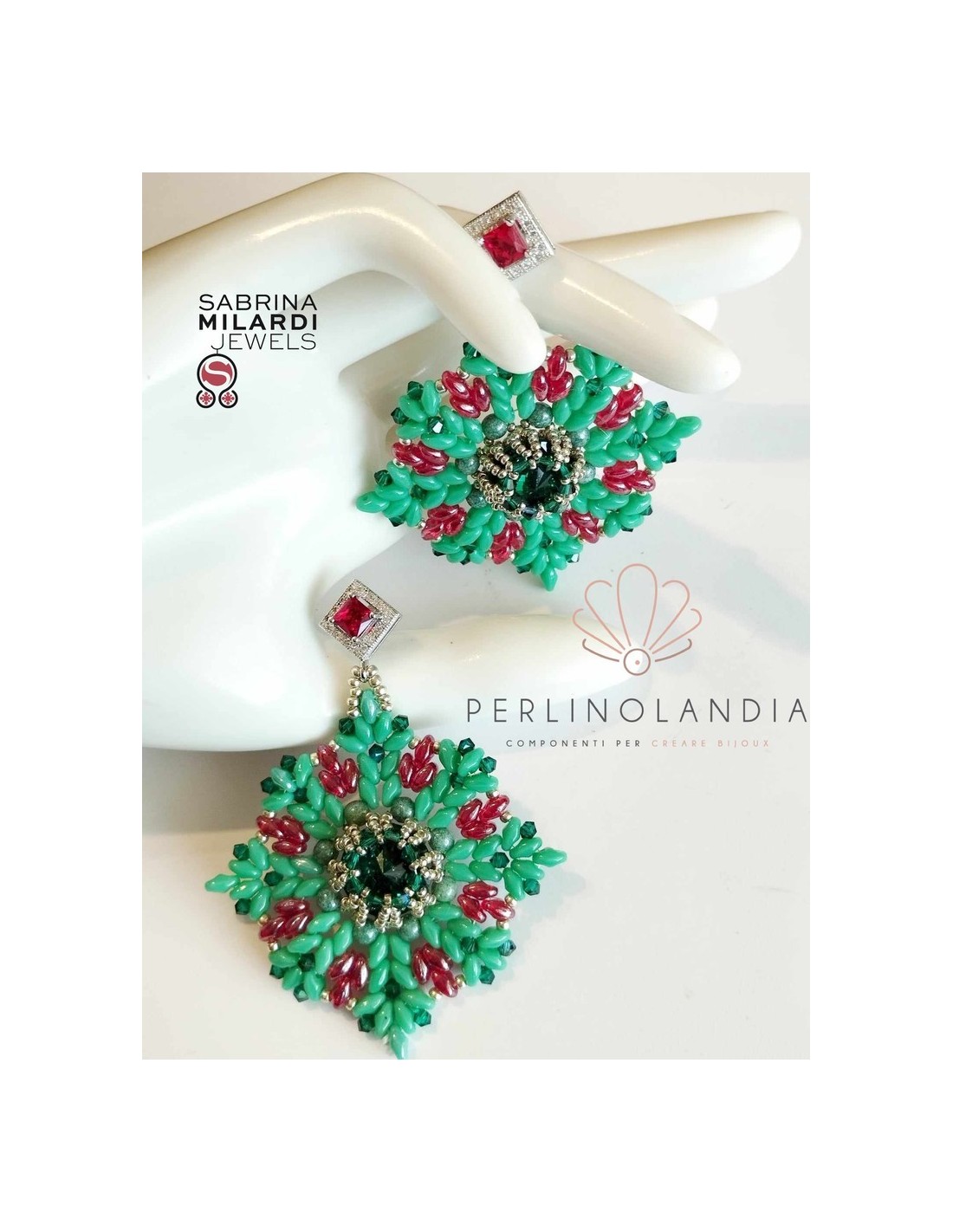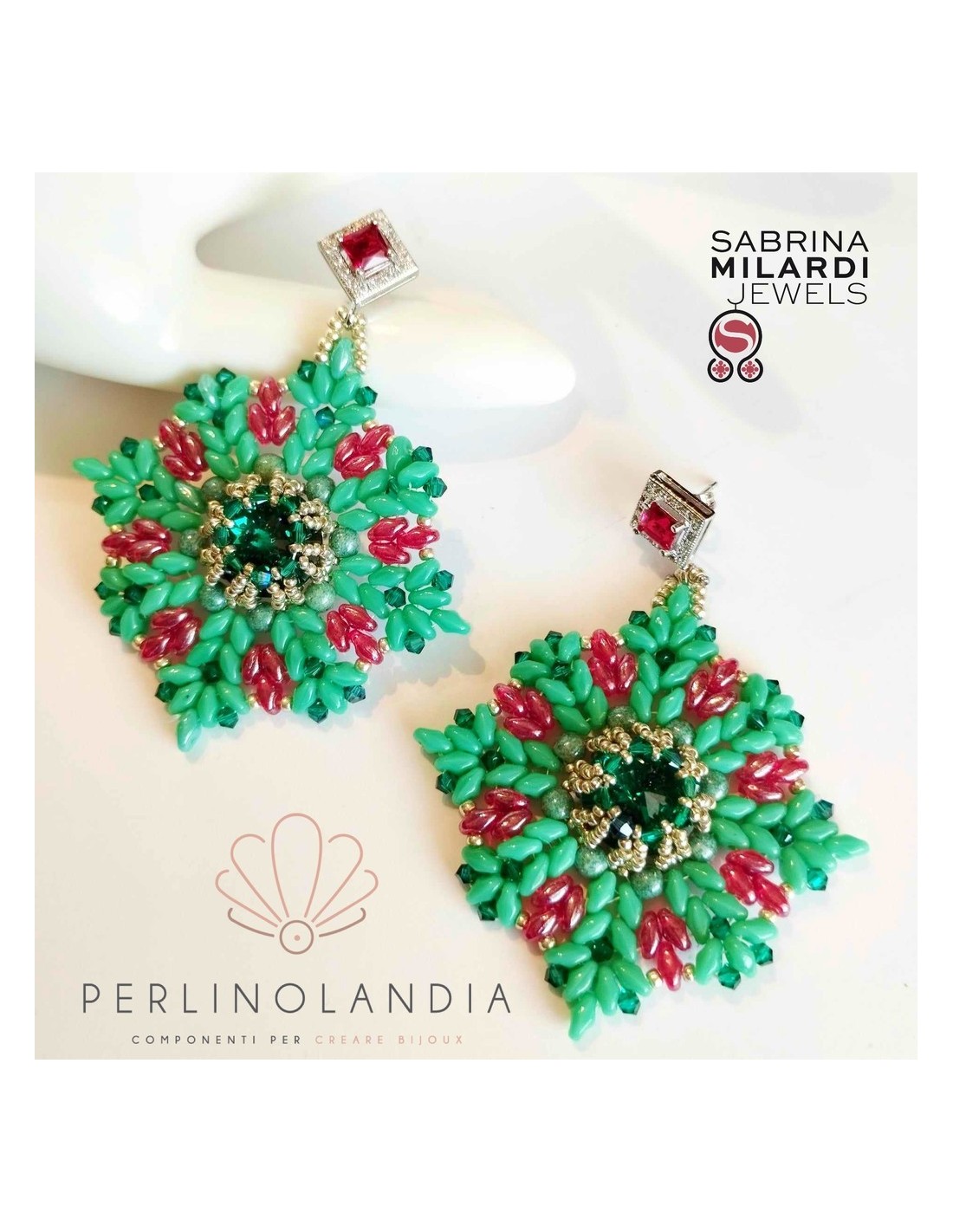 Aggiungi un tocco di luce e brillantezza al tuo stile con gli orecchini decorati con perline in vetro pressato Superduo e cristalli original Swarovski. Al centro, un favoloso rivoli original Swarovski cattura e riflette la luce in modo incantevole. Questi orecchini sono perfetti sia per un abbigliamento casual che per un look elegante, donandoti sempre un tocco di classe e raffinatezza. Anche il perno è un dettaglio straordinario. Questo perno luminoso è decorato con un bellissimo cristallo rosso e brillantini che aggiungono ulteriore luminosità e scintillio. Lunghezza orecchino: 7,5cm, larghezza: 5,5cm.